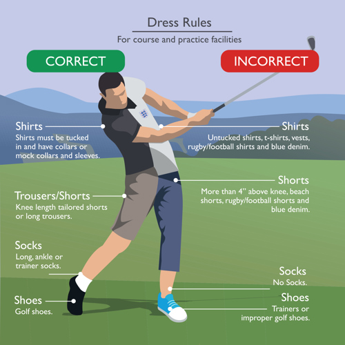 For men, shirts must be tucked in and have collars or mock collars and sleeves, with knee-length tailored shorts or long trousers. Long, ankle or trainer socks are to be worn with golf shoes.